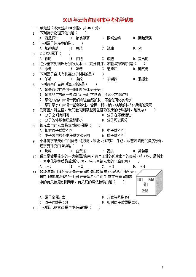 2019年云南省昆明市中考化学真题试题(word版含答案解析)