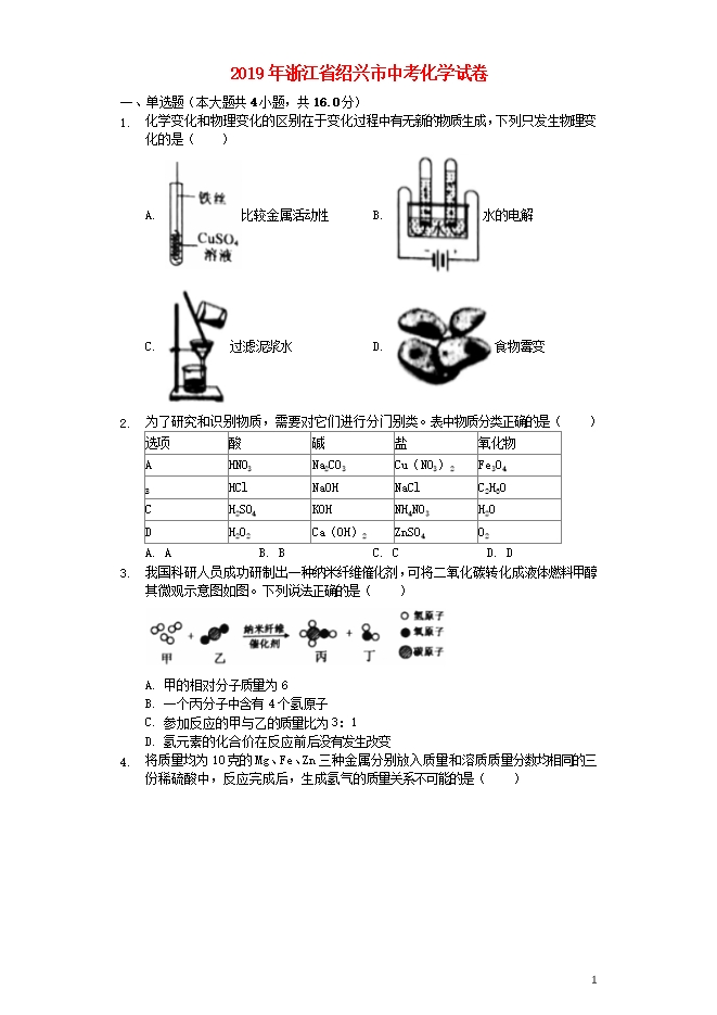 【内容简介】2019年浙江省绍兴市中考化学真题试题(word版含答案解析)