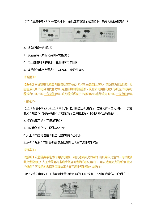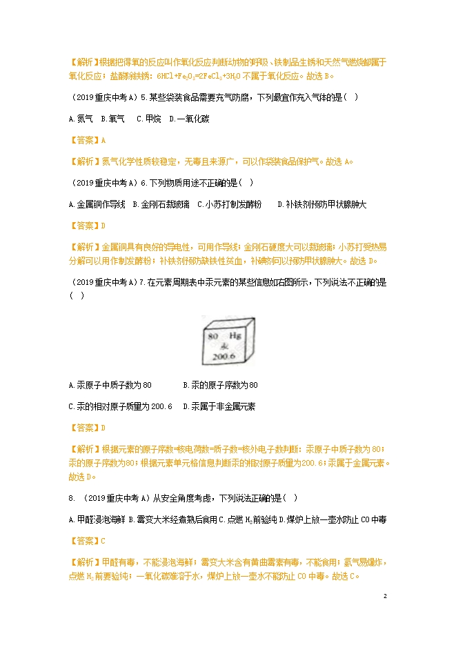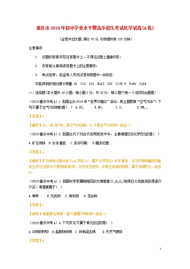【内容简介】2019年重庆市中考化学真题试题(A卷word版含答案解析)