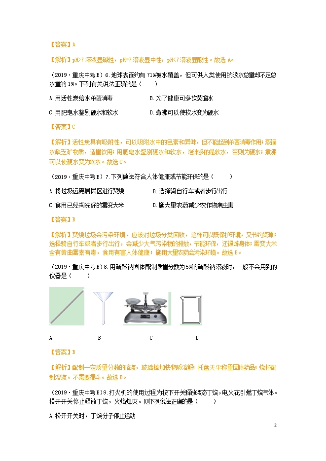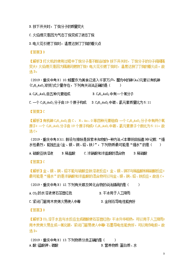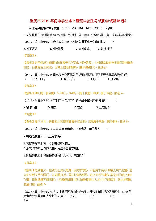 【内容简介】2019年重庆市中考化学真题试题(B卷word版含答案解析)