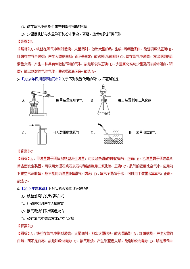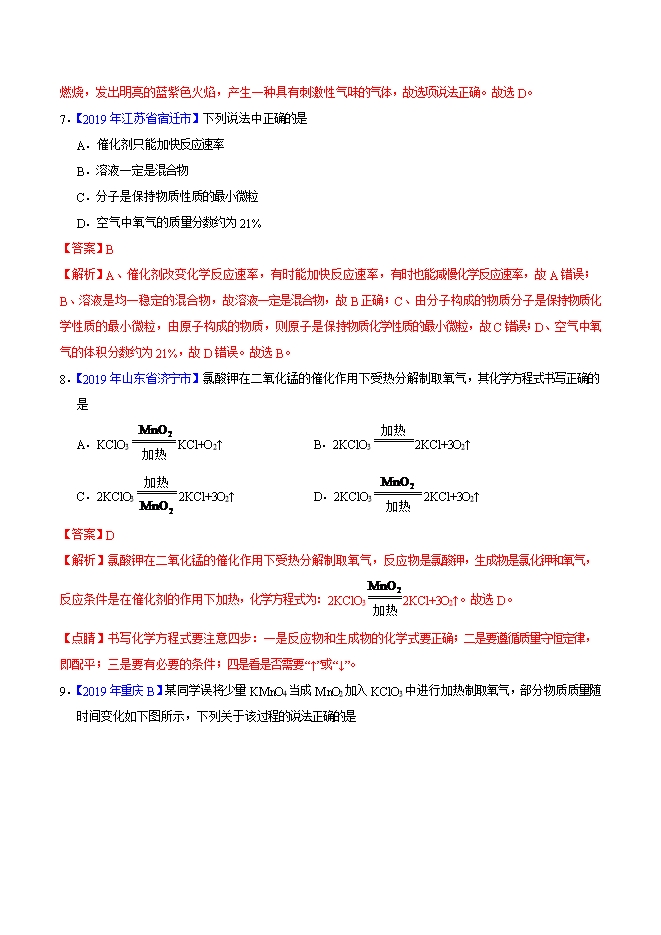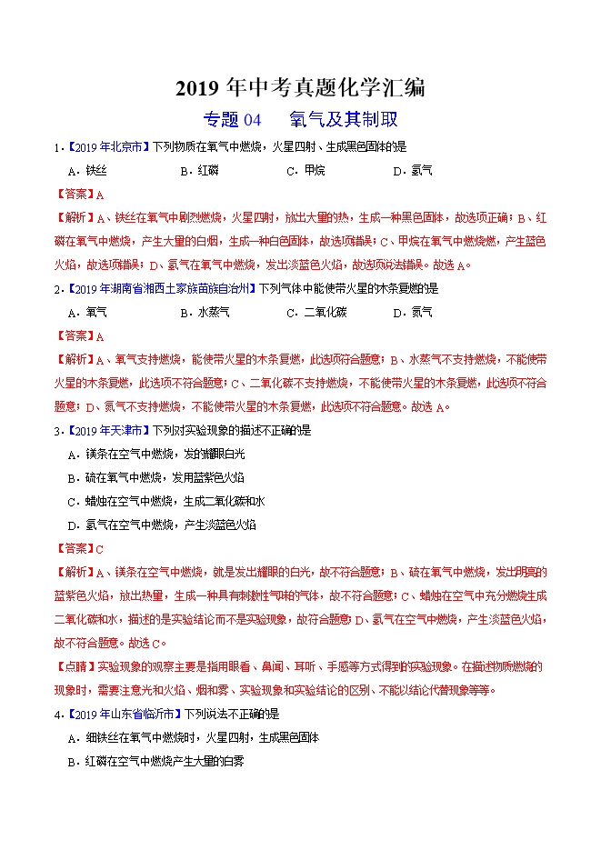 2019年中考真题化学试题汇编专题04 氧气及其制取(解析版)