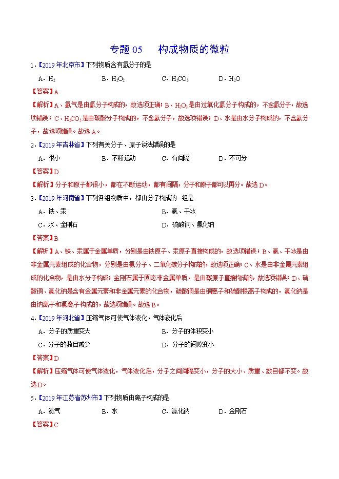 【内容简介】2019年中考真题化学试题汇编专题05 构成物质的微粒 (解析版)