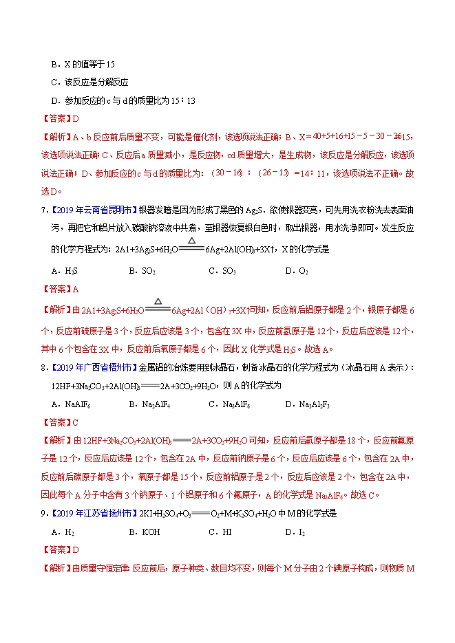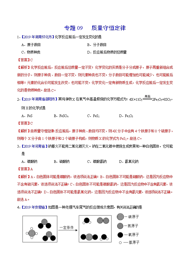 2019年中考真题化学试题汇编专题09 质量守恒定律(解析版)