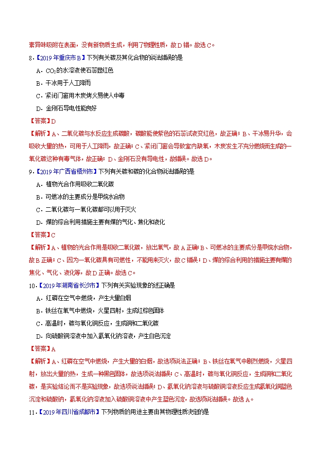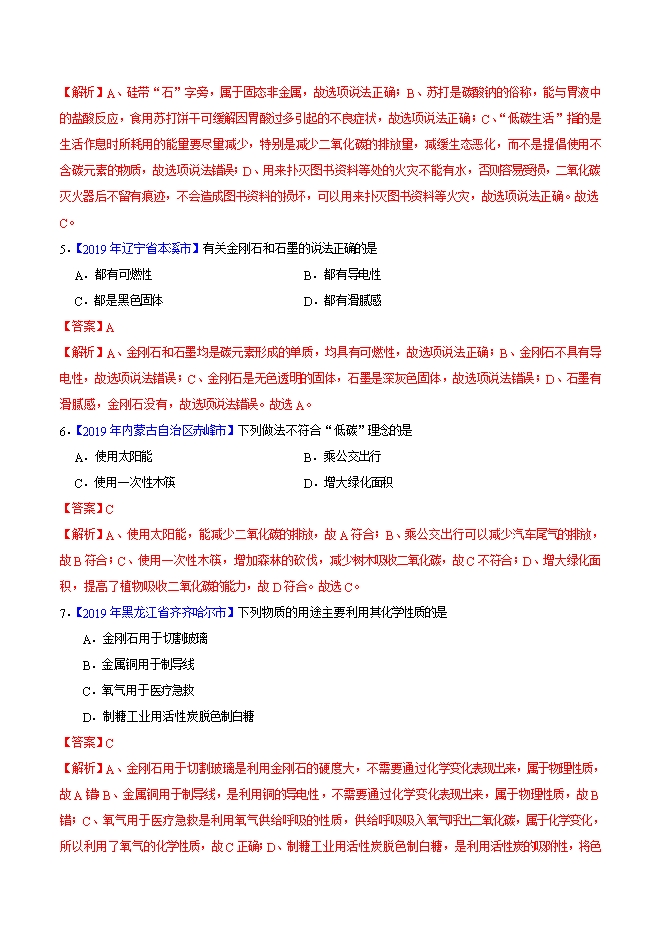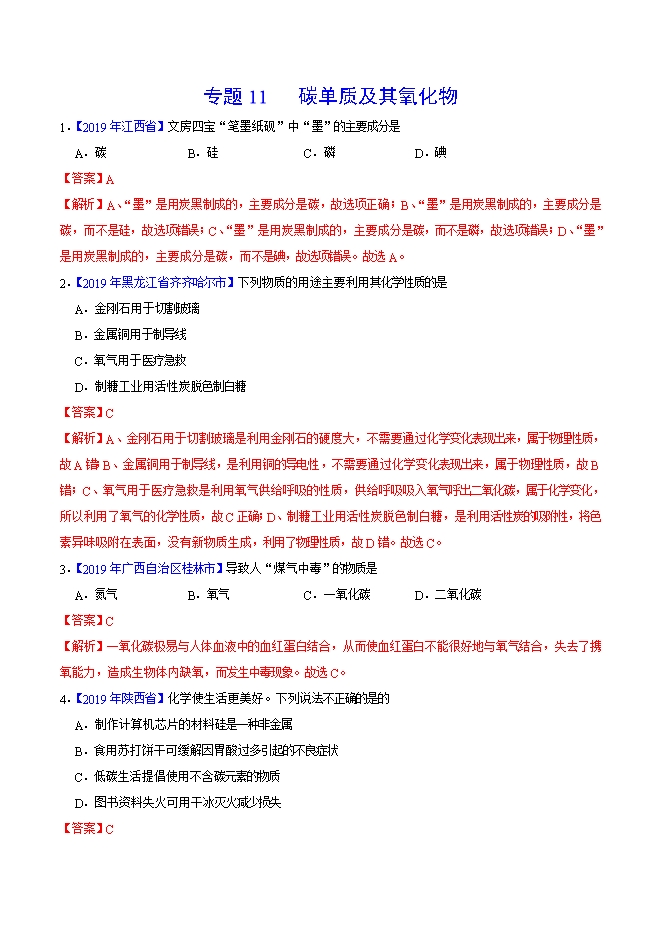 2019年中考真题化学试题汇编专题11 碳单质及其氧化物(解析版)