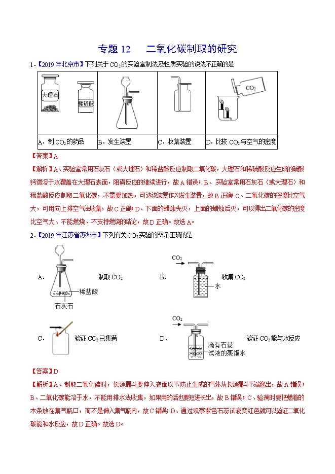 【内容简介】2019年中考真题化学试题汇编专题12 二氧化碳的制取的研究(解析版)
