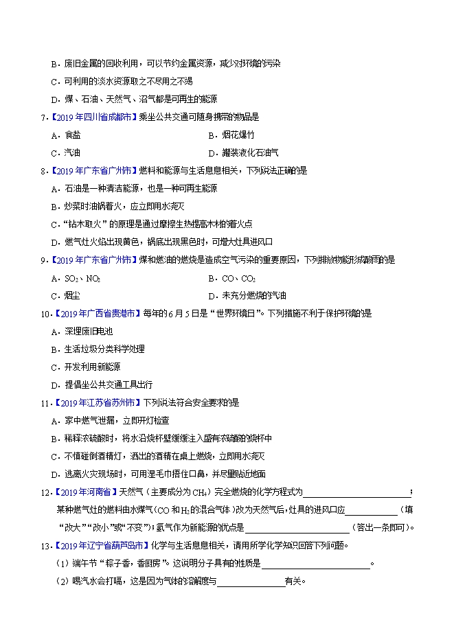 2019年中考真题化学试题汇编专题14 燃料的合理利用与开发(原卷版)