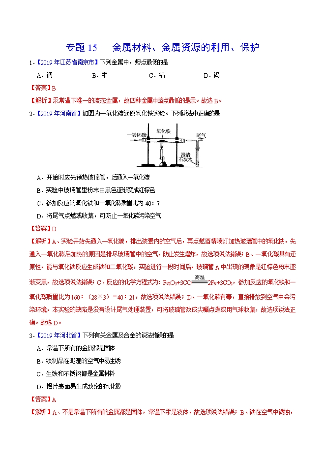 【内容简介】2019年中考真题化学试题汇编专题15 金属材料 (解析版)