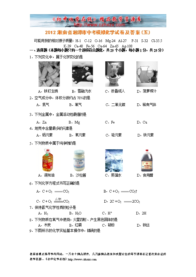 2012湖南省湘潭市中考模拟化学试卷及答案(五)