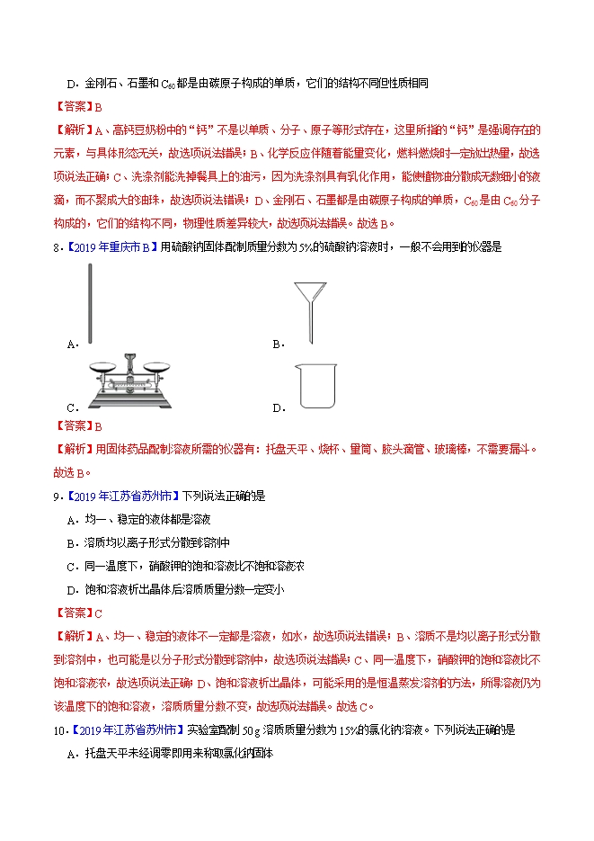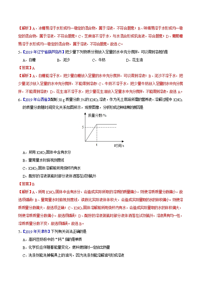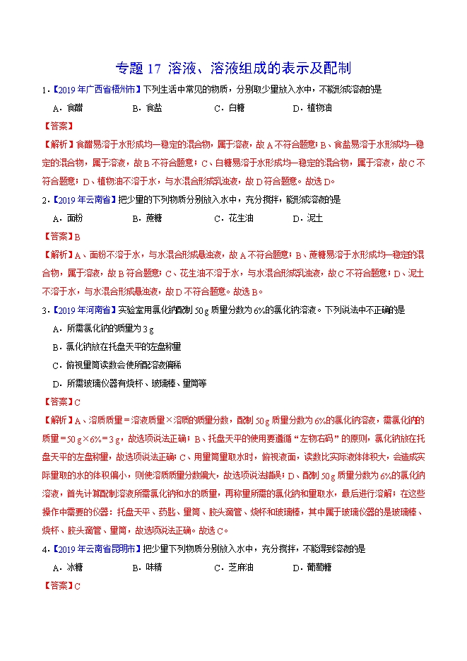 【内容简介】2019年中考真题化学试题汇编专题17 溶液、溶液组成的表示及配制(解析版)