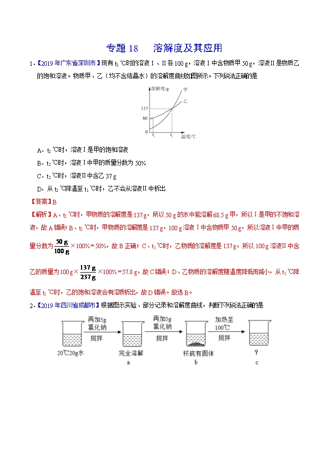 【内容简介】2019年中考真题化学试题汇编专题18 溶解度及其应用(解析版)