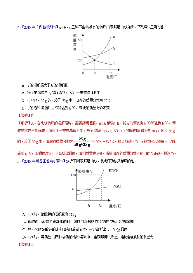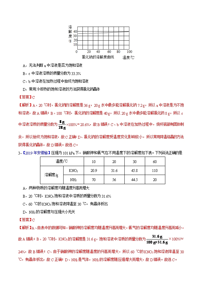 2019年中考真题化学试题汇编专题18 溶解度及其应用(解析版)
