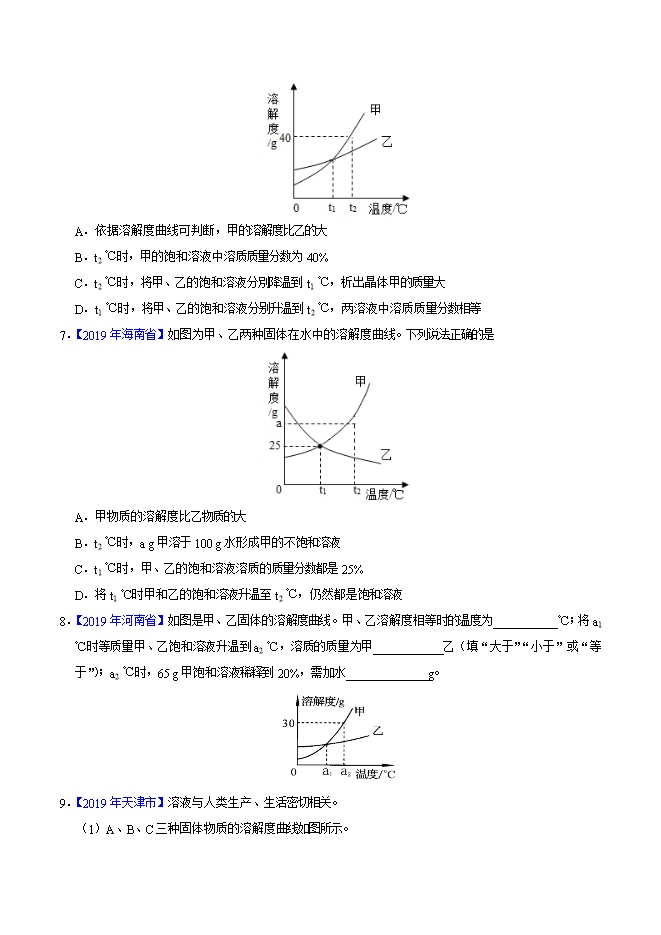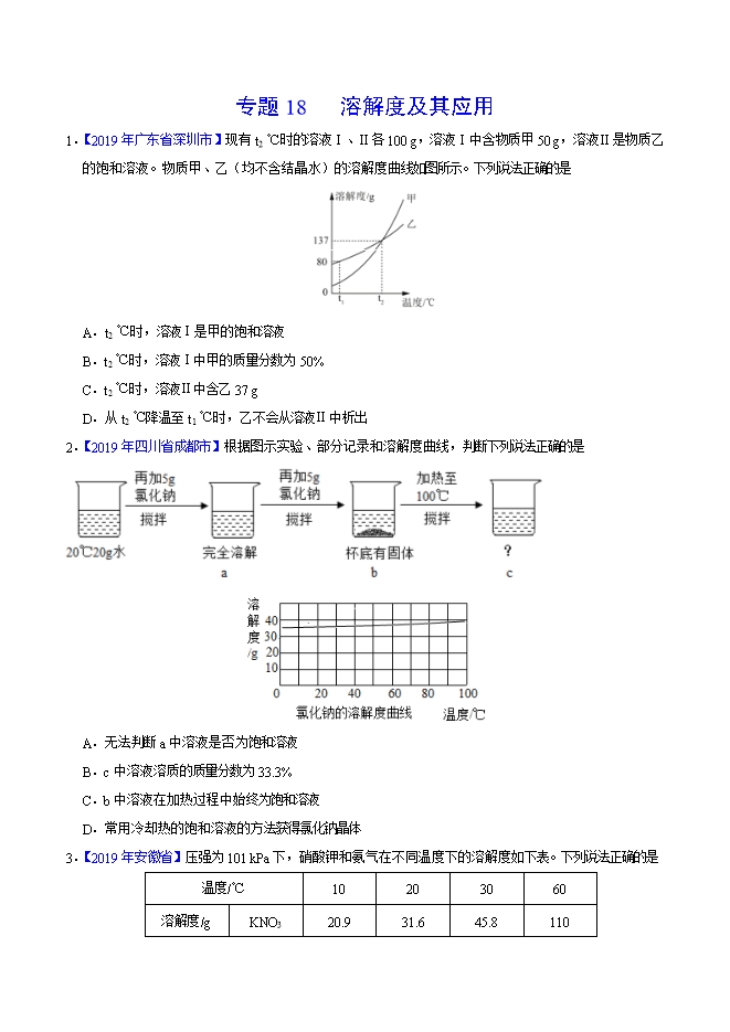 【内容简介】2019年中考真题化学试题汇编专题18 溶解度及其应用(原卷版)