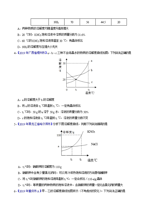 2019年中考真题化学试题汇编专题18 溶解度及其应用(原卷版)