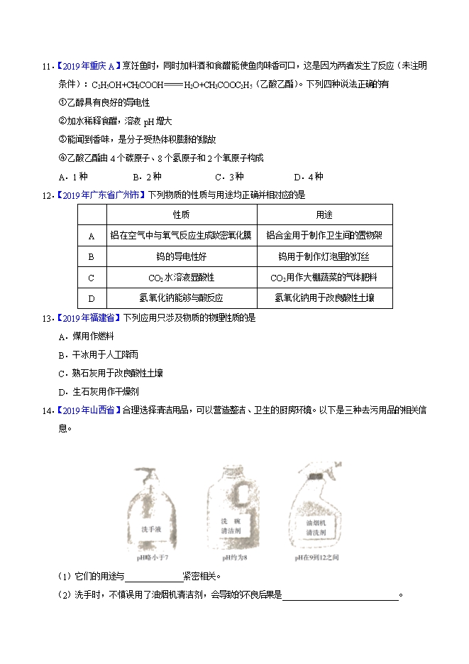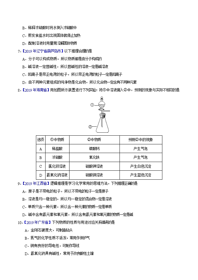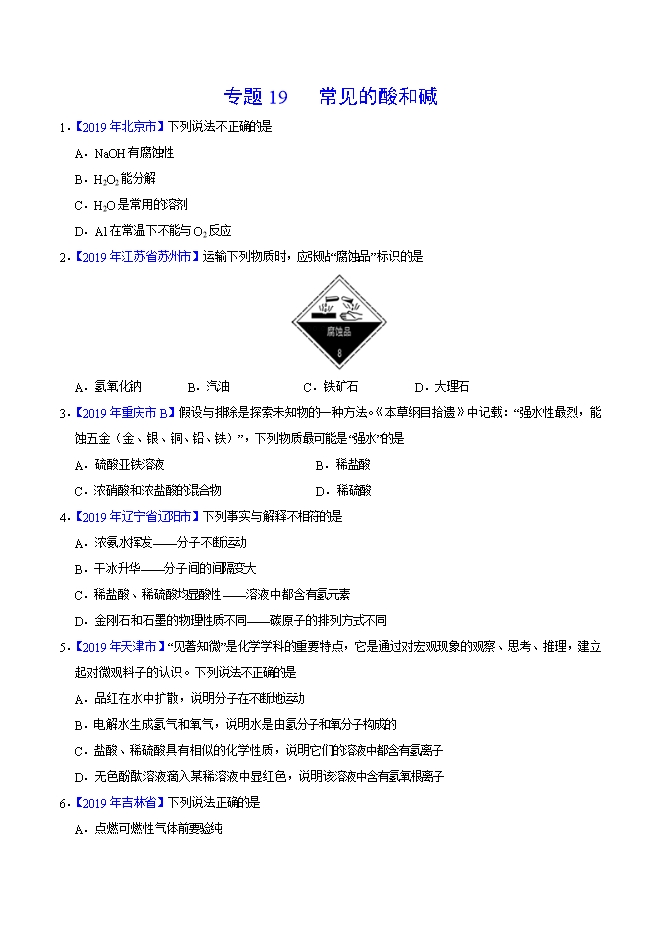 【内容简介】2019年中考真题化学试题汇编专题19 常见的酸和碱(原卷版)