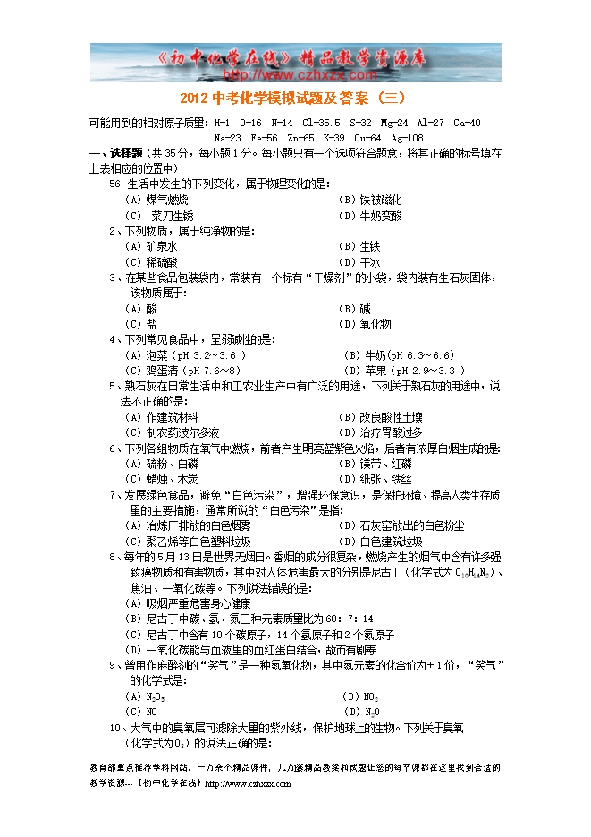 2012中考化学模拟试题及答案(三)