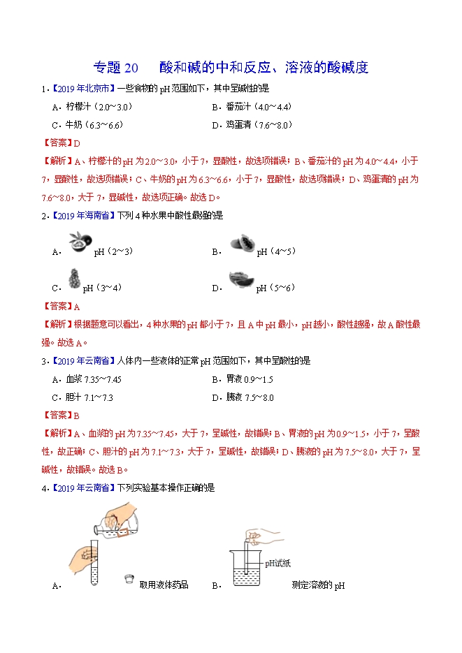 【内容简介】2019年中考真题化学试题汇编专题20 酸和碱的中和反应(解析版)