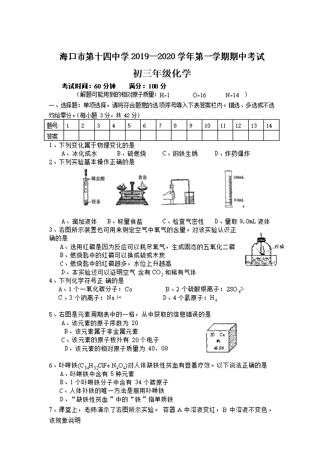 2020届海南省海口市第十四中学九年级上学期期中考试化学试题(word版含答案)