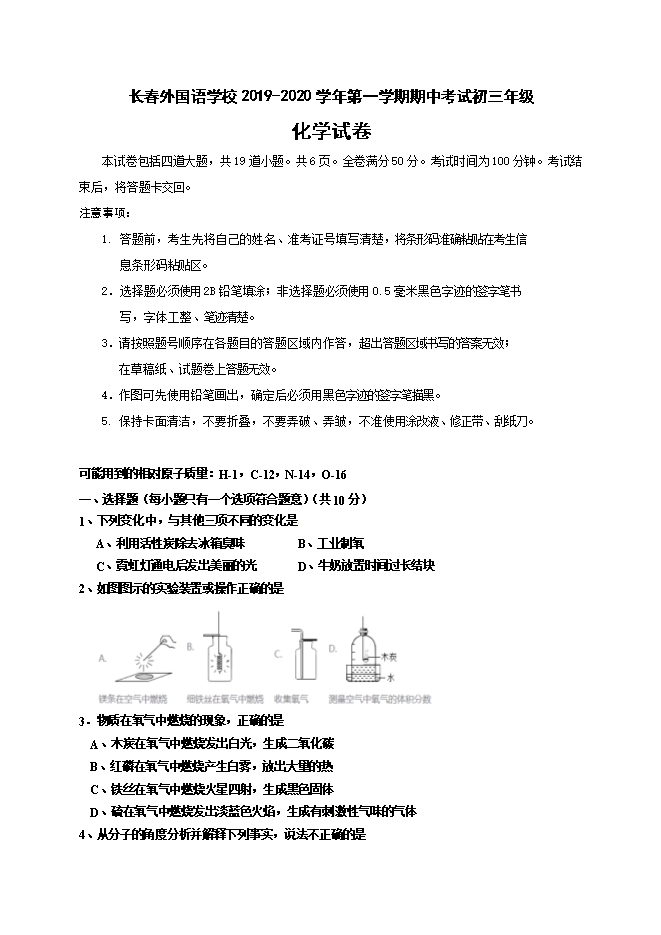 2020届吉林省长春外国语学校九年级上学期期中考试化学试题(word版含答案)