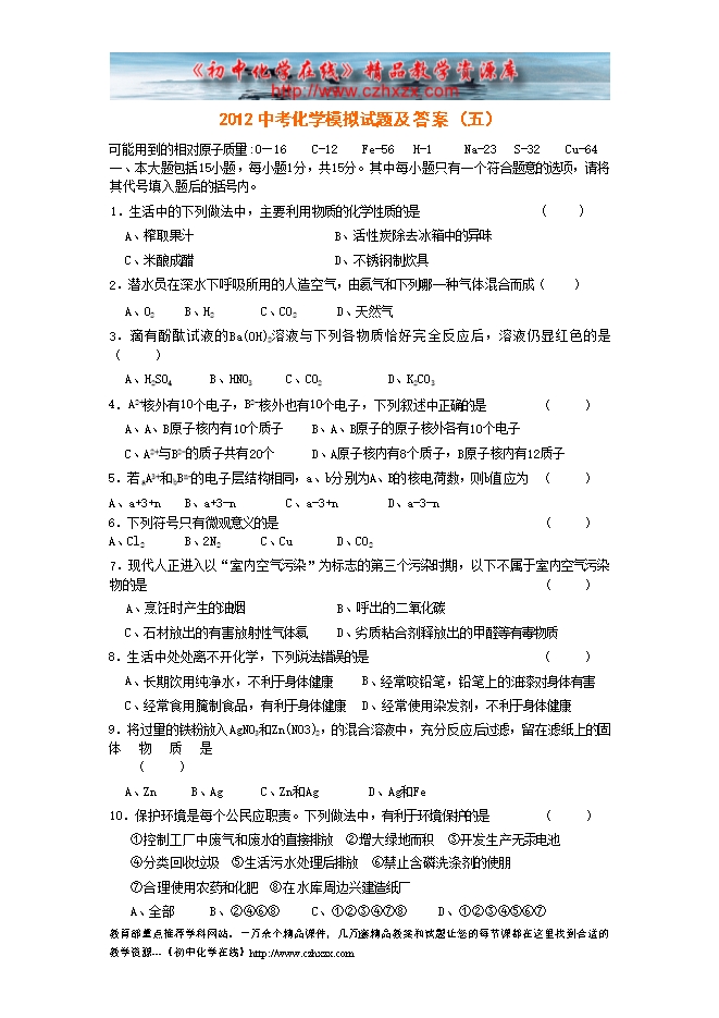 2012中考化学模拟试题及答案(五)