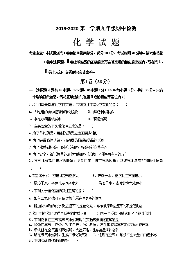 【内容简介】2020届山东省德州市陵城区江山实验学校九年级上学期期中考试化学试题(word版含答案)