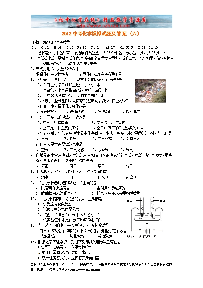 - 下一份试卷:2012中考化学模拟试题及答案(七)