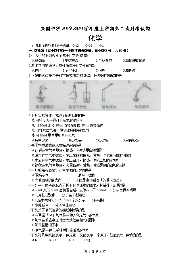 【内容简介】2020届甘肃省天水市秦安县兴国镇初级中学上学期期中检测 九年级化学试题(word版含答案)