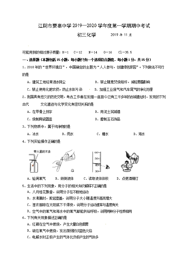 2020届江苏省江阴市第一初级中学、要塞中学九年级上学期期中考试化学试题(word版含答案)