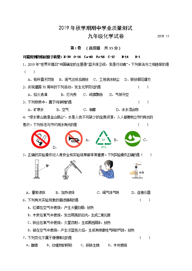 2020届江苏省无锡市阳山中学九年级上学期期中考试化学试题(word版含答案)