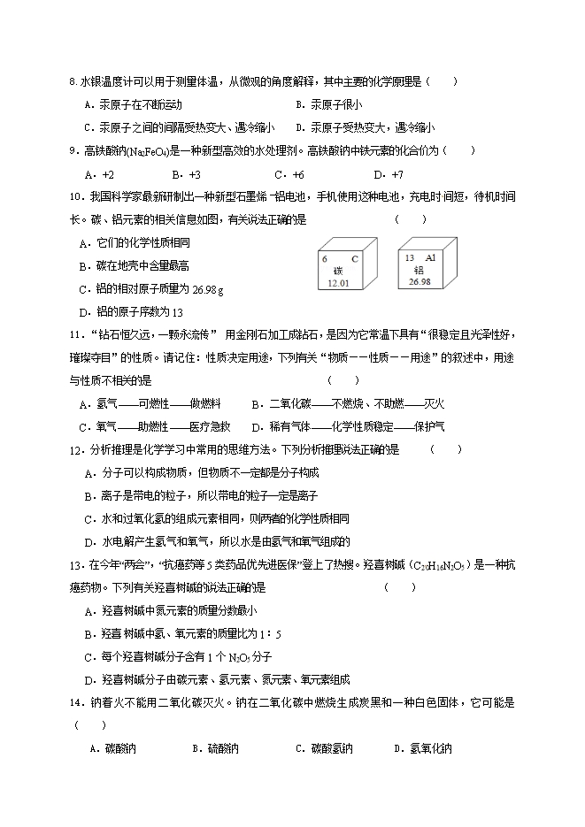 所属专辑: 《2020届全国各地九年级上学期期中考试化学试题汇总》专辑