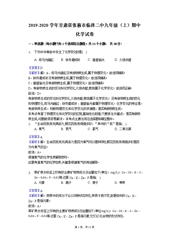 【内容简介】2020届甘肃省张掖市临泽二中九年级(上)期中化学试卷(Word版解析卷)