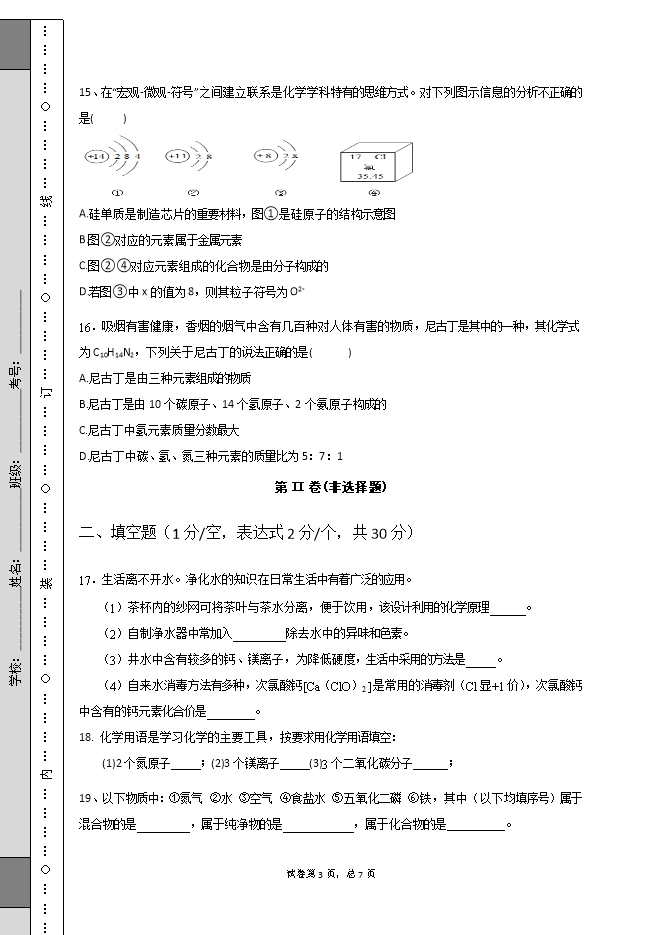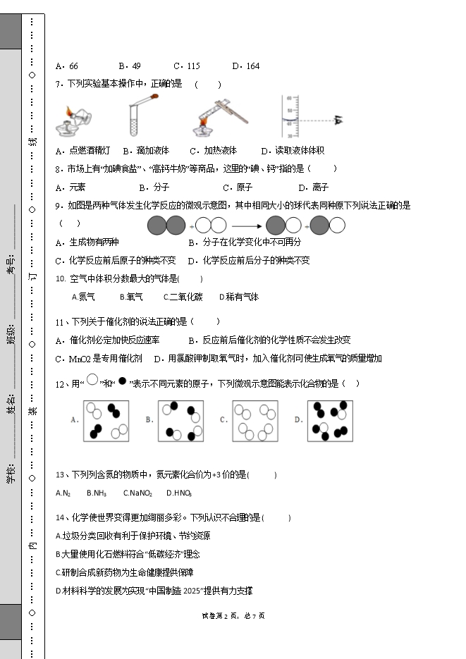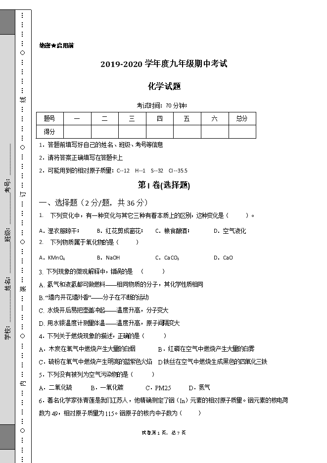 2020届山东省德州市九年级上学期期中考试化学试题(word版含答案)