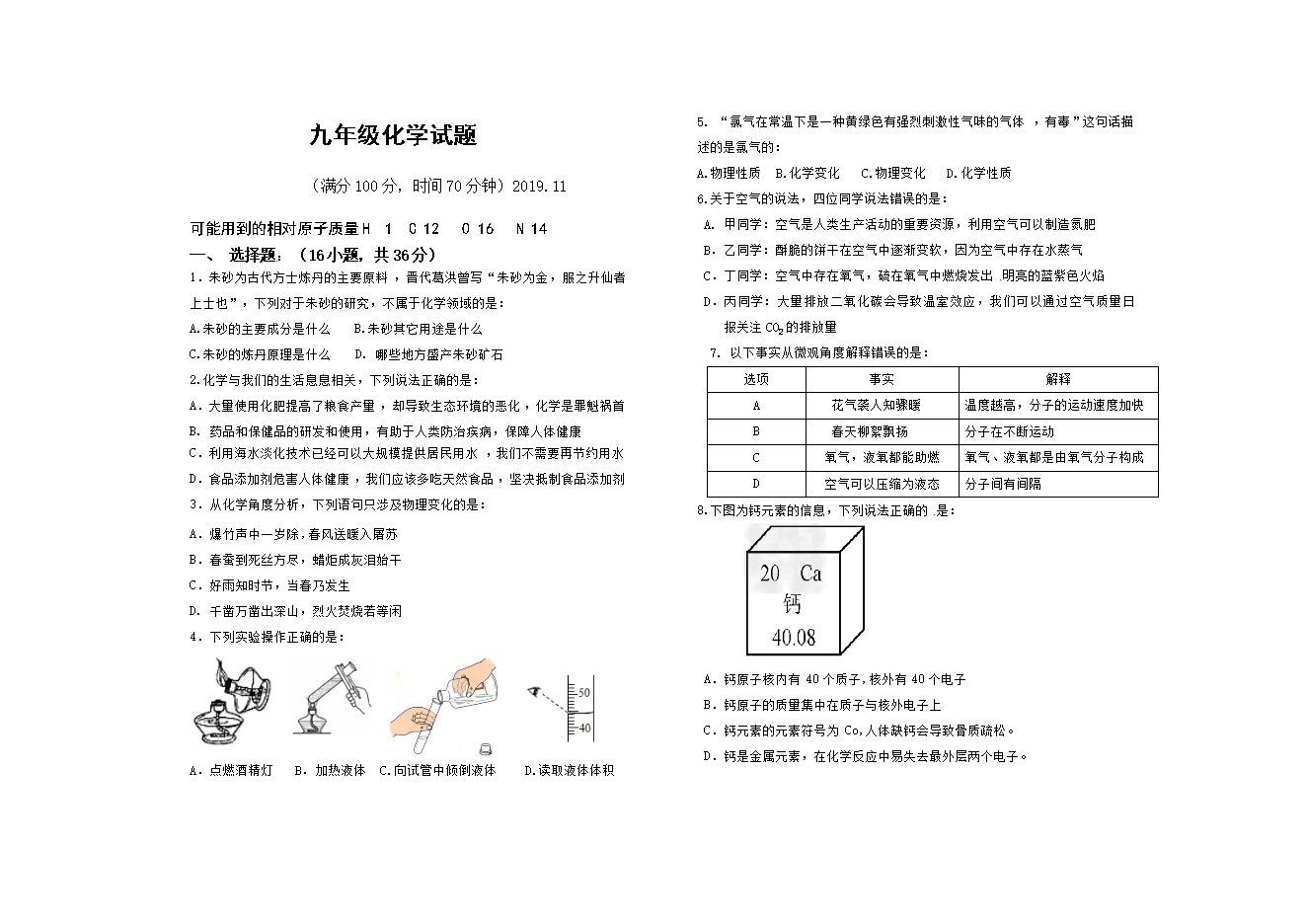 所属专辑: 《2020届全国各地九年级上学期期中考试化学试题汇总》专辑
