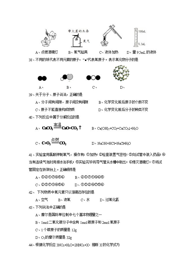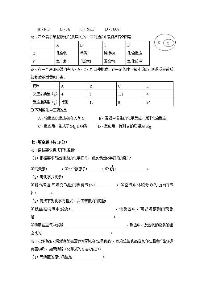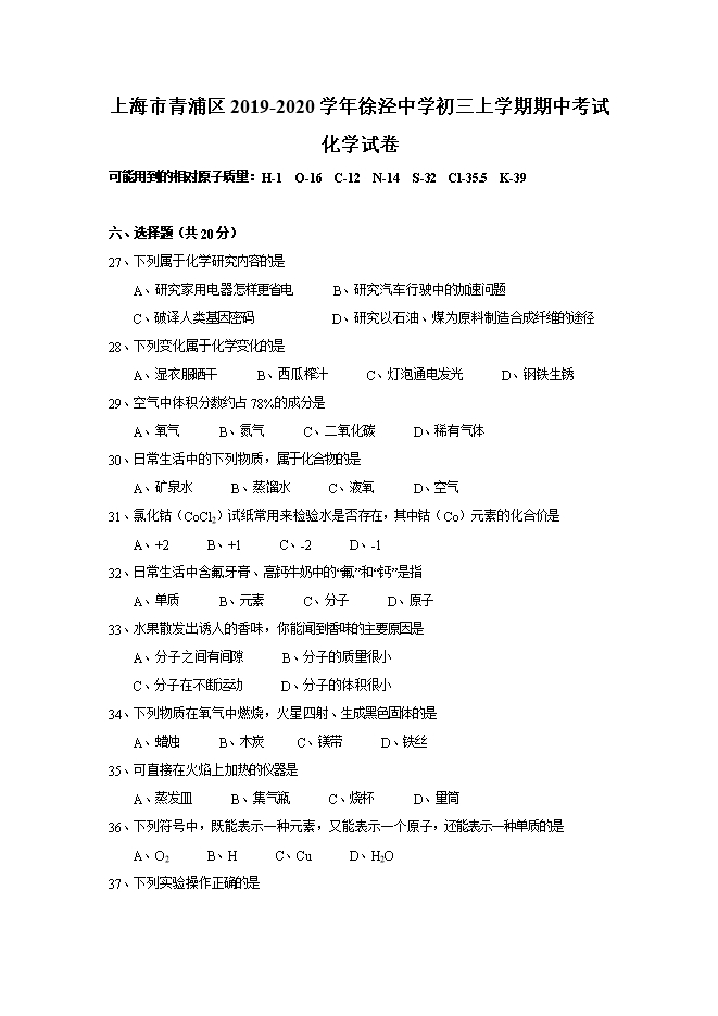 【内容简介】2020届上海市青浦区徐泾中学初三上学期期中考试化学试卷(word版含答案)