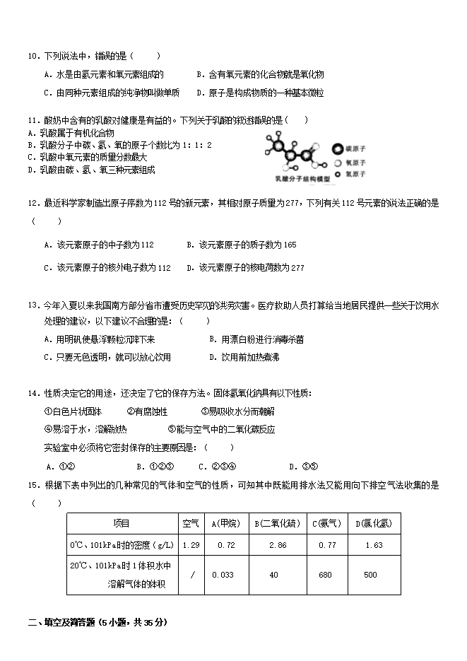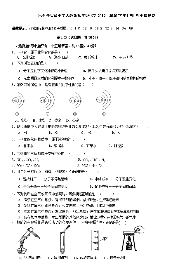 2020届四川省资阳市乐至县实验中学人教版九年级化学上学期期中检测卷(word版含答案)