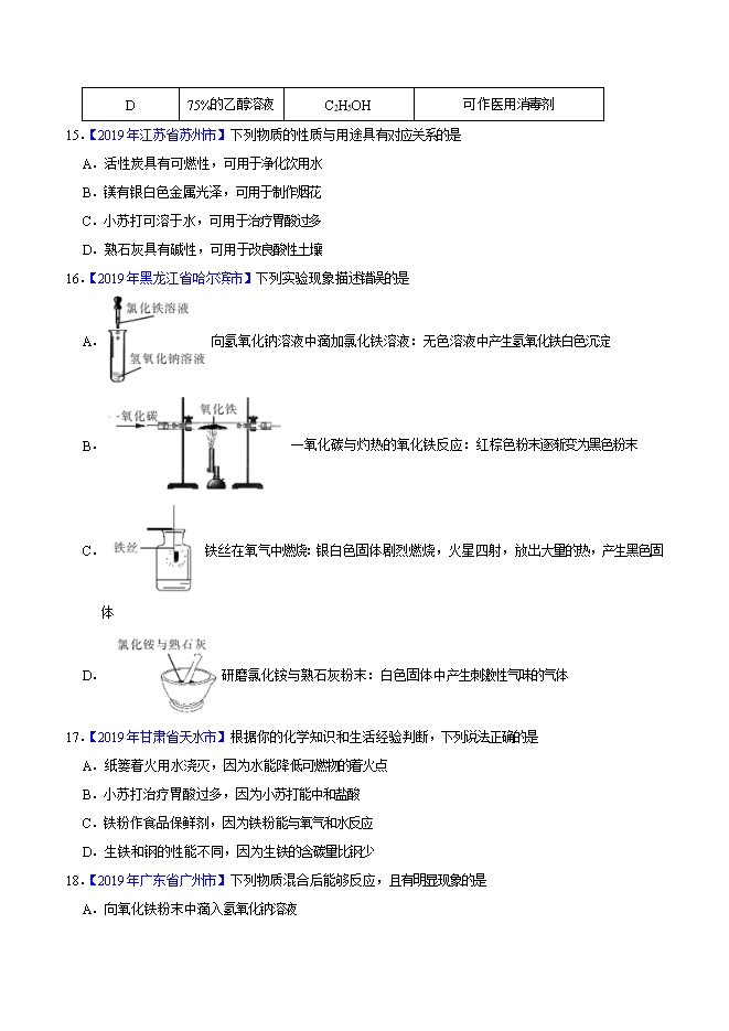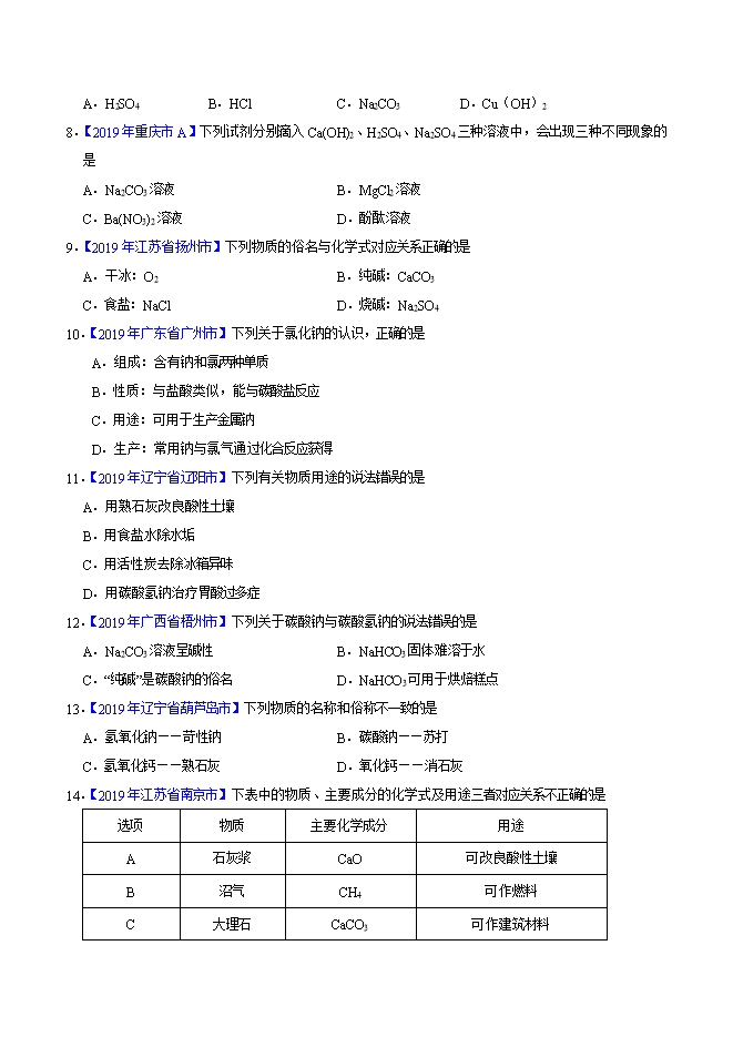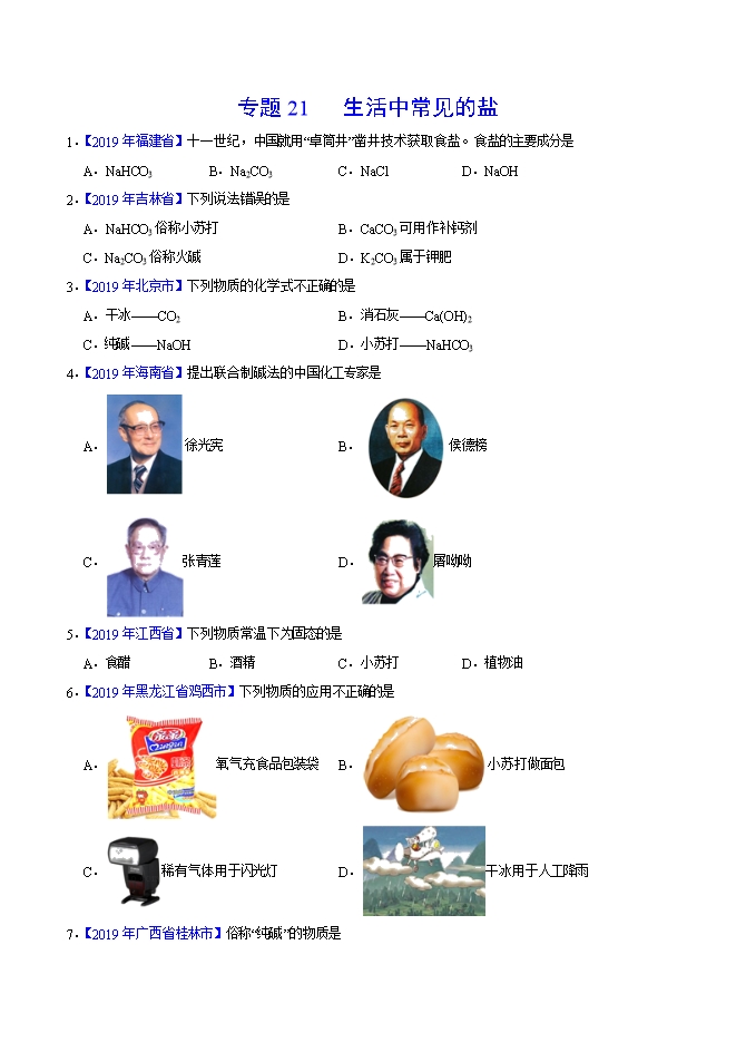 【内容简介】2019年中考真题化学试题汇编专题21 生活中常见的盐(原卷版)