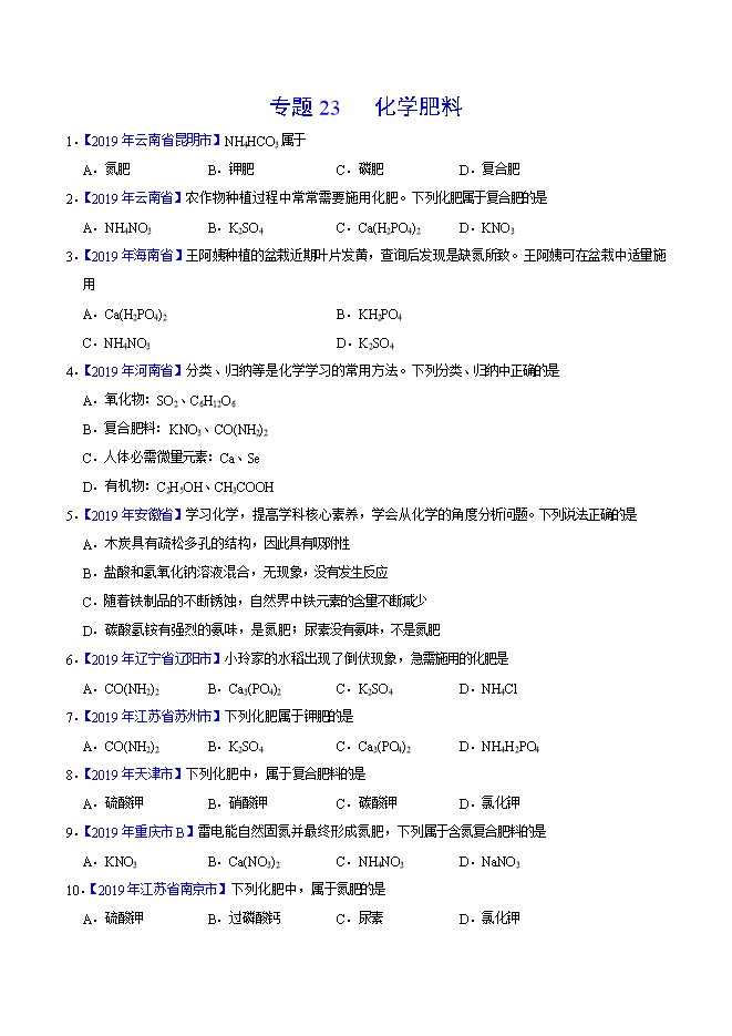 【内容简介】2019年中考真题化学试题汇编专题23 化学肥料(原卷版)