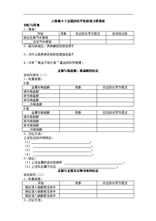 - 上一份资料:人教版《8.2金属的化学性质》教案及教学反思