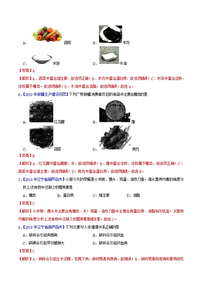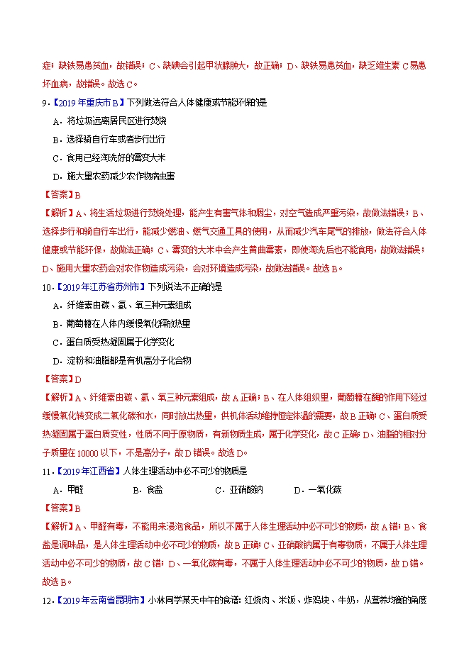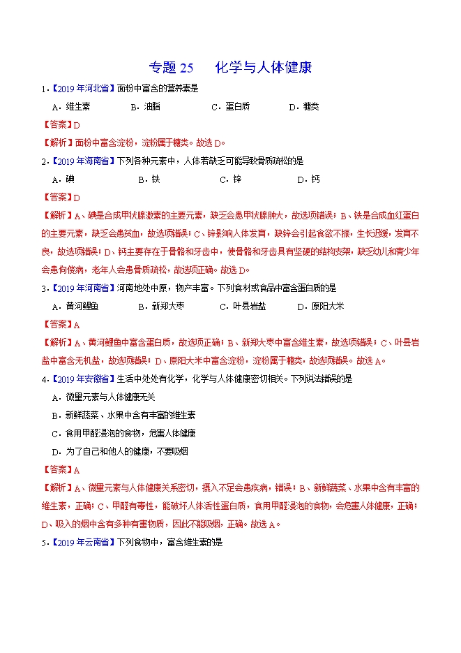 2019年中考真题化学试题汇编专题25 化学与人体健康(解析版)