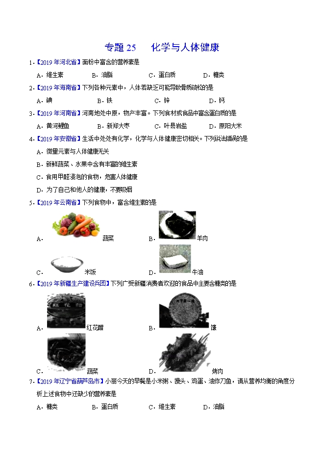 【内容简介】2019年中考真题化学试题汇编专题25 化学与人体健康(原卷版)