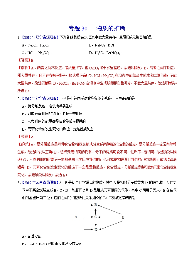 【内容简介】2019年中考真题化学试题汇编专题30 物质的推断(解析版)