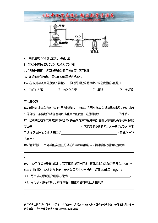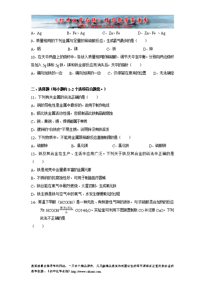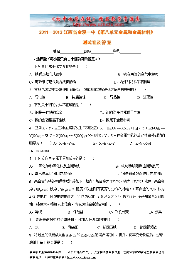 2011—2012江西省金溪一中《第八单元 金属和金属材料》测试卷及答案
