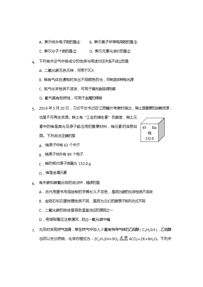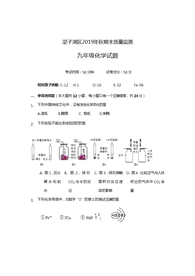 2020届湖北省鄂州市梁子湖区九年级上学期期末质量监测化学试题(word版含答案)