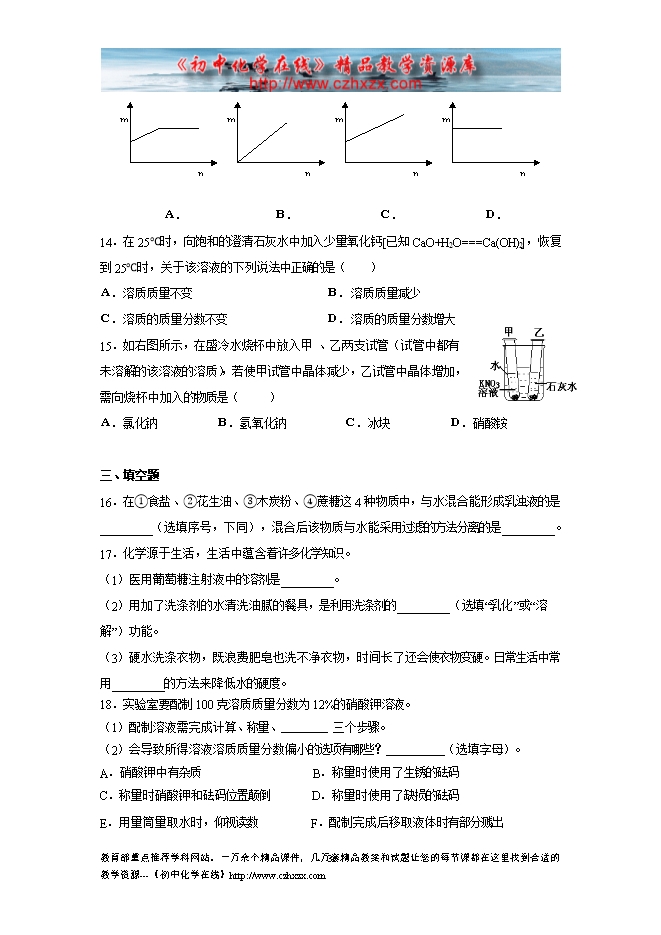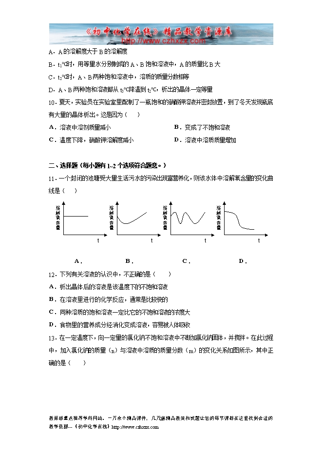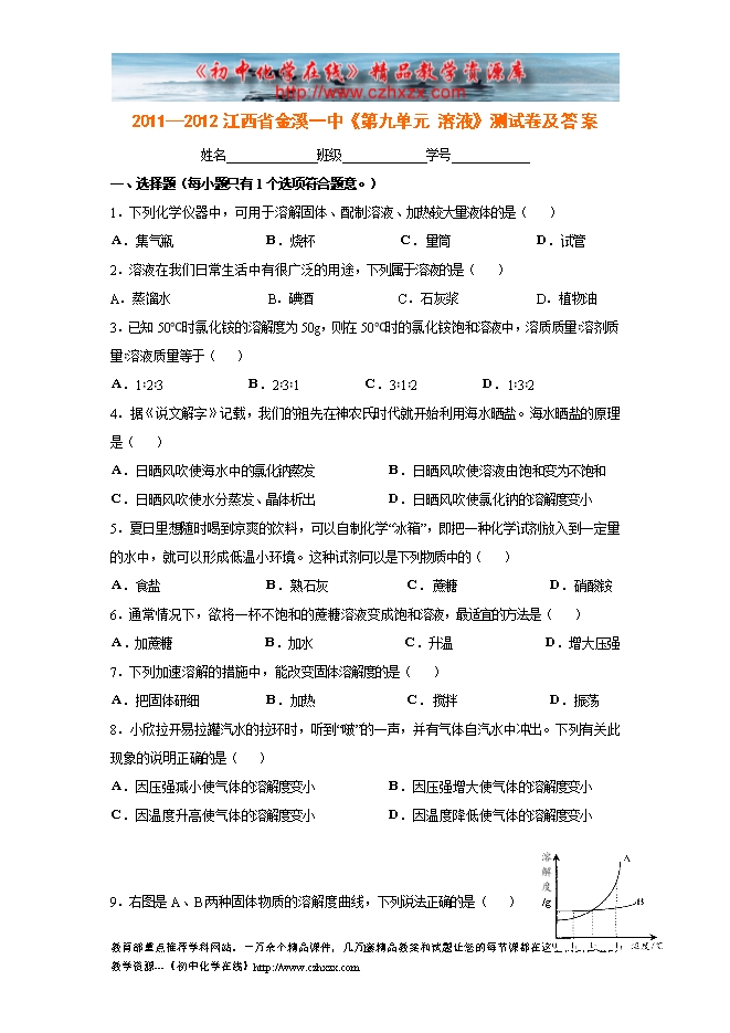 2011—2012江西省金溪一中《第九单元 溶液》测试卷及答案