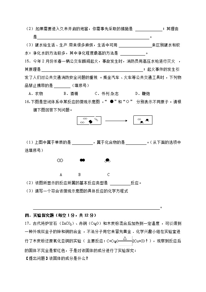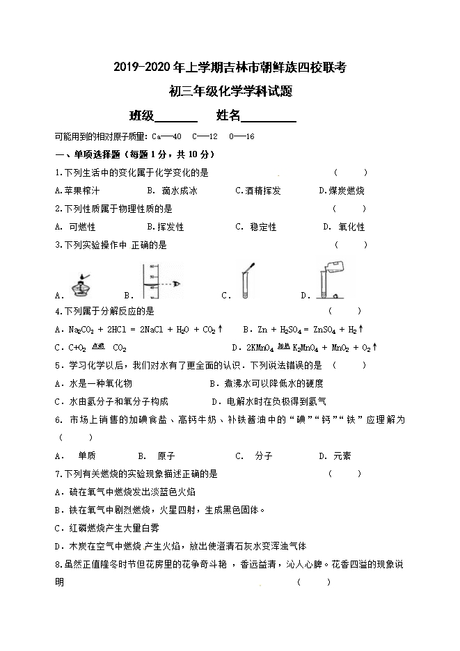 【内容简介】2020届吉林省朝鲜族四校联考九年级上学期期末考试化学试题(word版含答案)