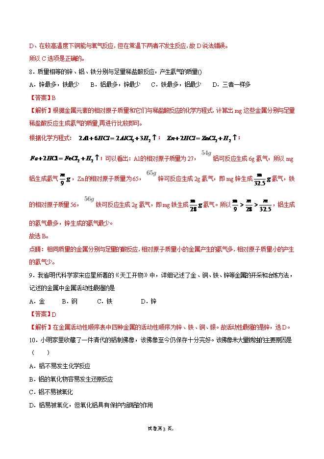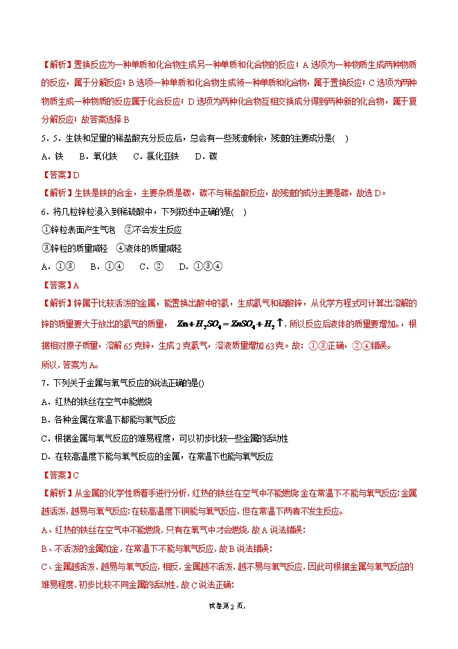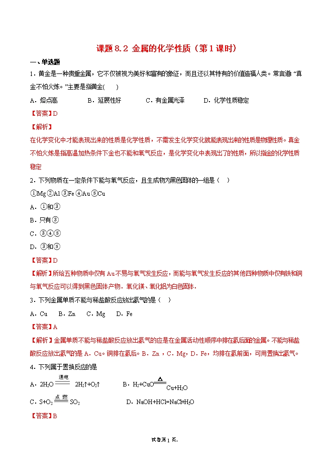 2019-2020学年人教版九年级化学下册《课题8.2 金属的化学性质 第1课时》同步练习(解析版)