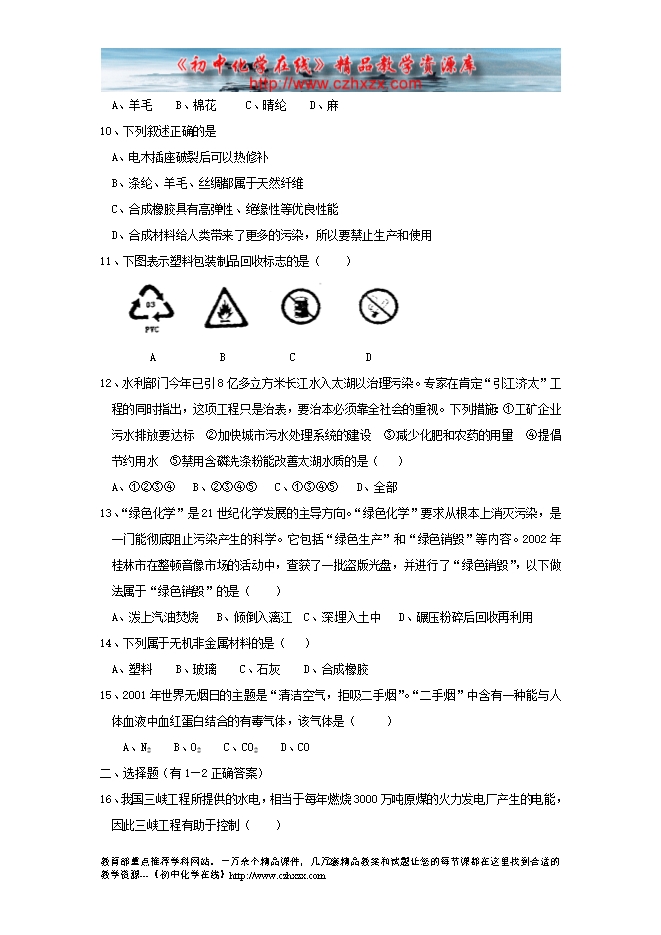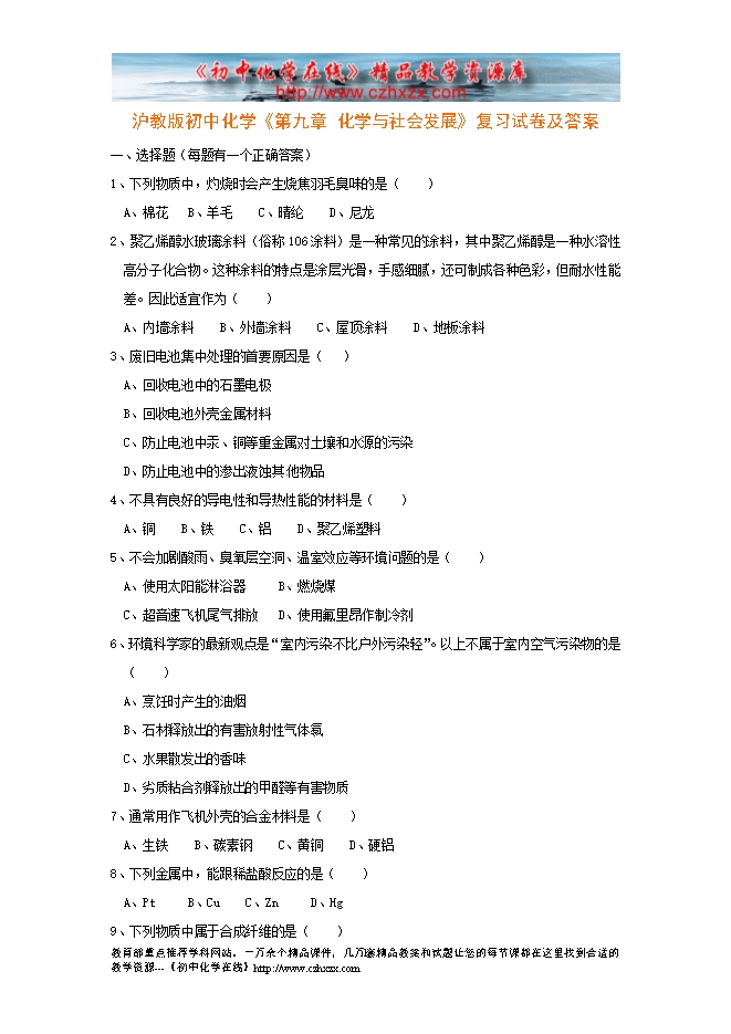 沪教版初中化学《第九章 化学与社会发展》复习试卷及答案