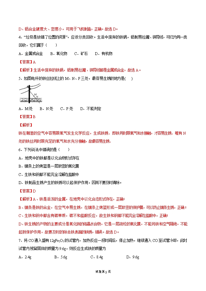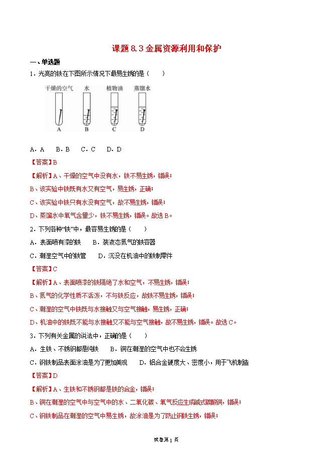 【内容简介】2019-2020学年人教版九年级化学下册《课题8.3金属资源利用和保护》同步练习(解析版)