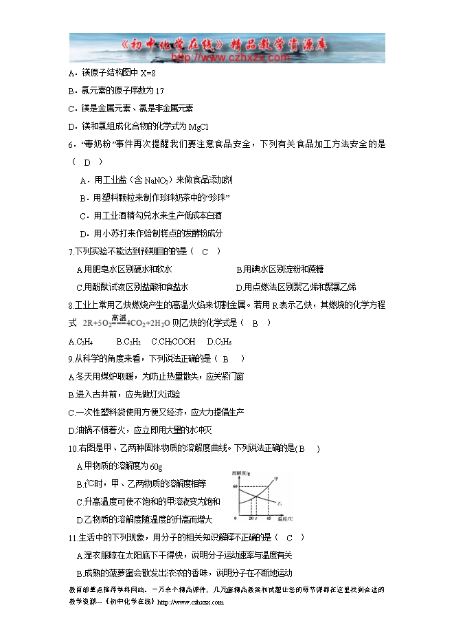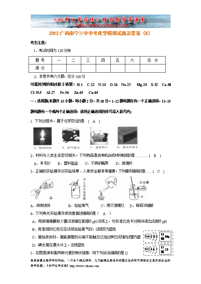 2012年广西南宁三中中考化学模拟试题及答案(2)
