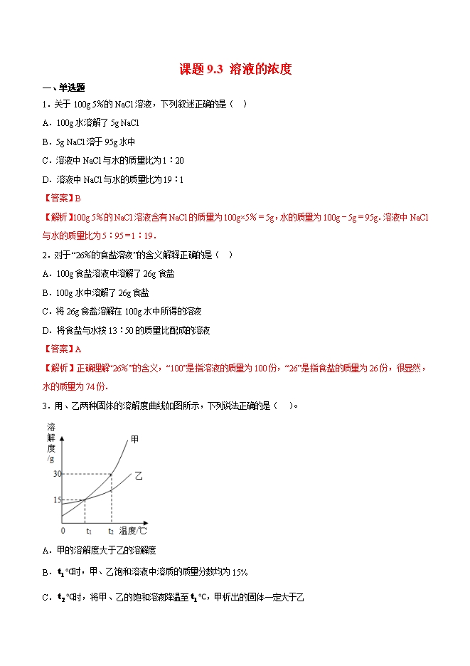 2019-2020学年人教版九年级化学下册《课题9. 3 溶液的浓度》同步练习(解析版)