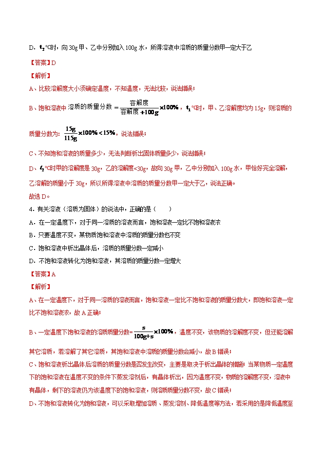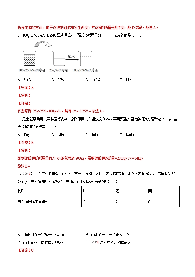 【内容简介】2019-2020学年人教版九年级化学下册《课题9. 3 溶液的浓度》同步练习(解析版)